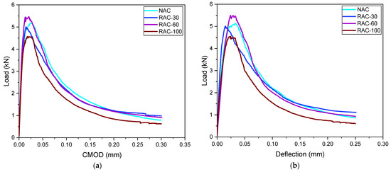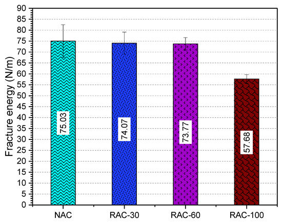 Figure 15 shows the fracture energy of the different concrete mixes studied. The incorporation of 30% and 60% RCA maintains fracture energy comparable to that of NAC. However, a complete substitution with RCA results in a significant decrease in fracture energy, with a reduction of 23.20%.