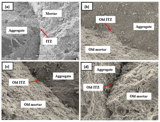 The characteristics of the ITZs are influenced by several factors. The quality of the mortar attached to the RCA plays an important role, while the quantity of this mortar has no significant effect on these characteristics [10]. Additionally, the moisture state of the RCA also affects the properties of the ITZs [11,12,13].