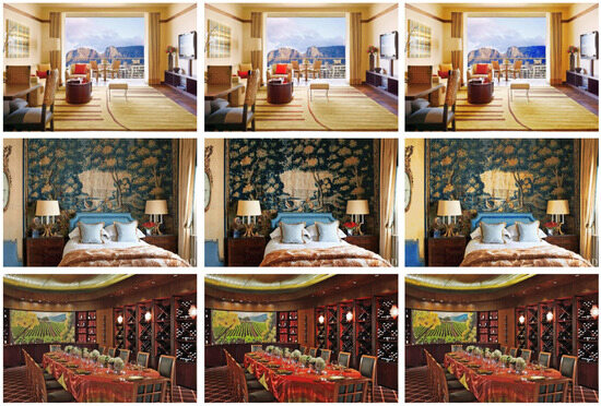 A total of 60 images were used as stimuli in this experiment. The subjective evaluations of ten of them were collected in Part I of a previous experiment [53], and in Part II, the same participants were asked to rate their perception of fifty images (10 RG from Part I OG, 10 YB from Part I OG, 10 OG for Part II, 10 RG for Part II, 10 YB for Part II). The ten images used in Part I were set as the original (OG) images. While the spatial distribution of RG and YB colors (e.g., the location of reds in an image varied across images) was not explicitly quantified, images were manually selected to include both simple and complex indoor environments with varied color distributions to ensure a representative sample. To offer a range of values (extremely high and very low) for each evaluated image quality assessment metric, the image quality was calculated in advance. Images were chosen to depict a variety of perceived levels of visual complexity (simple vs. complicated) and color vibrancy (achromatic vs. colorful). Three examples of original images, RG-enhanced images, and YB-enhanced images are shown in Figure 2. Due to the complexity of the stimuli, subtle color differences may be challenging to discern in a small format. High-resolution versions of these images have been made available in an online data repository for detailed examination (see the Data Availability Statement for the link).