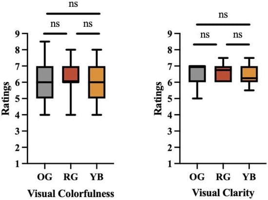 There were no statistically significant differences in visual (perceived) colorfulness and visual clarity between original (OG), red–green (RG) enhanced, or yellow–blue (YB) enhanced images.