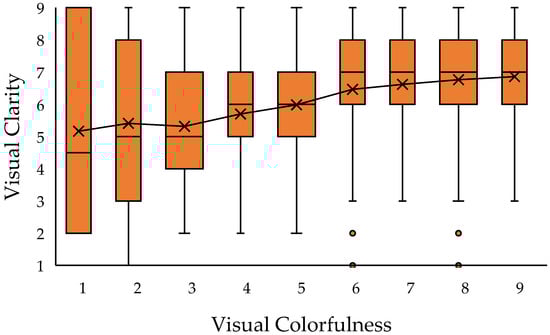 The distribution of visual clarity scores across visual (perceived) colorfulness reveals an increasing trend for clarity with higher levels of colorfulness.