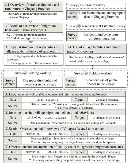 Based on the aforementioned framework, this study is structured into four main components (Figure 1) to explore the spatial dynamics of rural return in Zhejiang Province. Section 3.1 provides an overview of the return migration phenomenon in Zhejiang, offering contextual insights into broader trends in rural migration. Section 3.2 analyzes the spatial structure and migration patterns in three representative villages. Section 3.3 examines the housing and workspaces selected by urban-to-rural migrants, focusing on the resulting spatial transformations and changes to village layouts resulting from these settlements. Section 3.4 explores the use of public spaces by post-migration residents, analyzing the social integration of migrants and their interactions with established communities. By analyzing these distinct contexts and real dynamics, the study aims to offer a nuanced understanding of how rural return dynamics influence spatial and socio-economic transformations across Zhejiang Province.