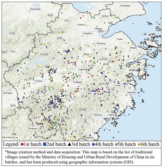 Zhejiang Province, located in the southeastern coastal region of China, is one of the country’s most economically advanced areas. Along with its capital, Hangzhou, and the cities of Shanghai and Nanjing, Zhejiang forms part of the Yangtze River Delta Economic Region [37], a pivotal hub for China’s economic growth. Despite its high degree of urbanization, approximately 40% of Zhejiang’s population—around 65 million people—still resides in rural areas, which are distributed across nearly 50,000 natural villages. These villages are densely concentrated, particularly in plains and coastal regions, and typically have small populations, averaging around 500 residents per village [38]. Between 2012 and 2023, a total of 728 villages in Zhejiang were selected in six batches to be included in the list of traditional villages in China [39] (Figure 2). These villages are recognized for their significant cultural and historical value, and due to their superior natural and cultural environments, have become important destinations for urban populations migrating to rural areas.