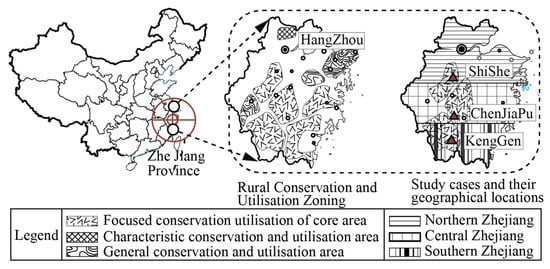 This study selects three representative villages—Shishe, Chenjiapu, and Kenggen—located in the northern, central, and southern regions of Zhejiang Province, respectively (Figure 3). The selected villages must exhibit a distinct and sustained phenomenon of rural return, ensuring that the spatial transformations within the villages are both pronounced and diverse due to an adequate sample size and extended observation period. Traditional villages, with their cultural heritage, landscape features, and architectural character, hold strong appeal for urban residents, making them ideal subjects for studying rural return. The three traditional villages examined in this study were carefully chosen as representative cases from this broader category. Among these, Shishe Village was included in the first batch of traditional villages, while Chenjiapu and Kangen Village were added in the third batch. These geographically and culturally diverse cases provide valuable insights into rural return migration and its implications for spatial development.
