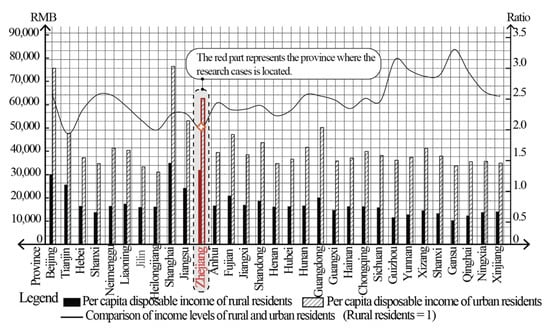 According to the per capita disposable income statistics from the China Rural Statistical Yearbook (Figure 4), Zhejiang Province stands out as one of the regions with the smallest urban–rural income gap in China, with relatively advanced rural infrastructure that facilitates rural migration. Following the 2005 policy shift towards the synergistic development of the economy and the environment [40] in Zhejiang, the province has made continuous strides in rural development. Many of its villages have now become models for rural revitalization in China, attracting a significant number of urban residents to return to rural areas.