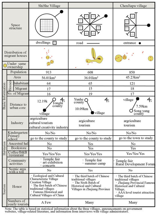 The evolution of villages in Zhejiang primarily follows two trajectories: the internal renewal of old villages and the construction of new villages [41]. New village construction generally targets original rural inhabitants, whereas urban migrants typically prefer to settle in traditional villages to immerse themselves in the rural cultural environment. As a result, the three case studies selected for this research are categorized under the internal renewal of old villages.