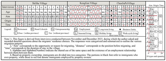 Figure 6 summarizes the migration types observed in the three villages, based on data collected through interviews with migrants. The classification integrates information about each migrant’s purpose, place of origin, and duration of stay in the village. The analysis identifies a total of ten distinct migration types (presented on the far right of Figure 6), with an uneven distribution across categories. The most prevalent group consists of migrants who work in the villages and reside there only during their work cycles. Overall, the data reveal that migrants with dual residency—splitting time between urban and rural locations—outnumber those who have long-term settled in the villages. Furthermore, the findings reveal a significant number of migrants who relocate to the villages to start businesses or seek employment, reflecting the influence of policy-driven initiatives aimed at supporting rural economic revitalization and encouraging urban-to-rural migration.