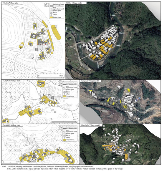 In this section, the specific impacts of urban-to-rural migration on village spaces are examined by analyzing the spatial structure of the villages through three key elements: streets, houses, and spatial nodes. The houses occupied by migrants are numbered to distinguish the spatial distribution of original residents and migrants. Figure 7, created from on-site measurements, illustrates this spatial information through both a general plan and a three-dimensional model, showcasing the reconfigured village space following rural return.