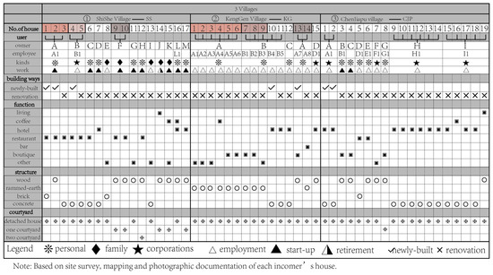 The table reveals that the identity characteristics of migrants vary according to the functional use of the houses they occupy. In some mixed-use commercial and residential properties, both the property owners and their employees reside, whereas others are inhabited by individuals with a single role. For instance, in Shishe Village, the occupants of houses (1, 2, 3), (4, 5), and 16 are (A, A1), (B, B1), and (L, L1), respectively, while house 6 is solely occupied by the property owner. Due to the preservation requirements of traditional villages, migrants primarily choose to renovate and make small-scale updates to existing buildings, striving to maintain the historical and cultural value of these traditional villages. Only a small number of newly constructed buildings are scattered within the villages, and these are also required to align with the architectural and aesthetic characteristics of traditional villages.