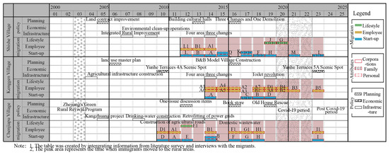 Rural return has become a long-term factor influencing the reconstruction of village space, contributing to the evolution of rural spatial dynamics alongside other factors. Figure 9 outlines the key policies and migration events in the three villages over the years. The role of policies in village evolution includes overall planning, economic development, and infrastructure construction. As shown in the figure, there is a temporal gap between the implementation of policies and the occurrence of migration, indicating that rural areas require time to create an environment that meets the needs of urban migrants. This is particularly evident in infrastructure development, reflected in the continuous improvement of public facilities ensuring modern living standards, such as activity squares, landscape enhancement, sanitation management, and the supply of water, electricity, and internet.