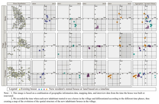 Rural return in the village is a gradual process, with new residents progressively occupying more areas of the village over time. Initially, they settle in one or two houses, but as the migration process continues, they expand to occupy dozens of houses, becoming a significant architectural presence within the village. Prior to migrating to the village, most individuals rent old houses or homesteads within the village. Based on interviews with them, we have gathered data on the specific timings of house reconstruction or new construction, which was used to create a spatial evolution diagram. Figure 10 illustrates the changes in village space over time under the influence of the rural return wave. The process radiates outward from the core of the village, gradually creating a situation where the spaces occupied by both local inhabitants and migrants are integrated. As migration progresses, new types of spatial functions emerge, better aligned with contemporary needs.