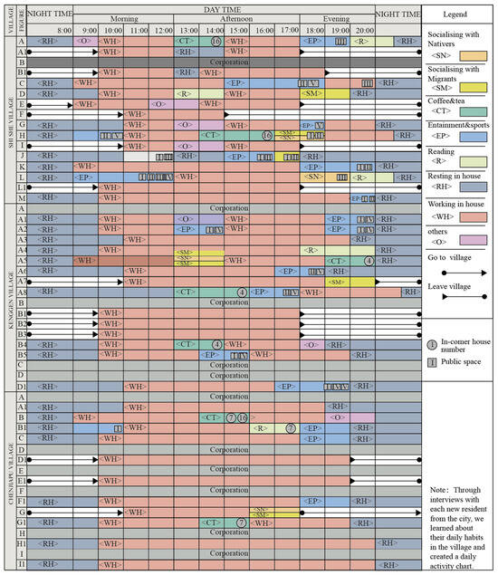 In this section, to explore the lifestyle of incoming residents and their integration into village spaces, we conducted interviews with each migrant to gather insights into their daytime activities outside their houses. The section focuses on the use of public squares and communal buildings within the village. By documenting the nature and timing of public activities, we assess how migrants are assimilating into the village community.