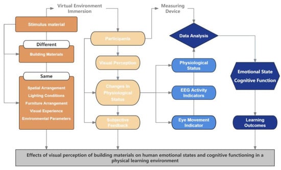 VR technology enables immersive experiences and interactive visualizations in architectural research, allowing researchers to safely examine the effects of indoor environments in controlled settings []. When combined with physiological response measurement techniques from neuroscience, VR facilitates a deeper understanding of how built environments influence emotional states and cognitive functions, thereby providing more accurate and comprehensive data. This approach effectively complements the quantitative assessment of visual changes and addresses the limitations of subjective qualitative methods adopted in prior studies [,]. For example, VR has been used to create learning environments that enhance students’ experiential learning [], confirm the positive effects of biophilic indoor layouts on human physiology and emotions [], and investigate the impact of classroom width on students’ attention and memory by simulating virtual classrooms []. By enhancing insights into human emotional and cognitive responses, VR technology contributes innovative tools for the design and evaluation of architectural materials in PLEs.