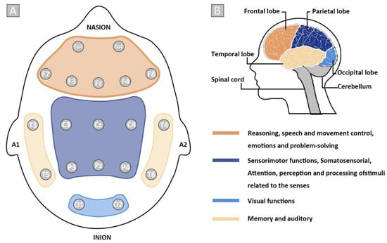 Schematic diagram of main brain regions and electrode placement. (A) EEG electrode placement. (B) Functional roles of brain regions.
