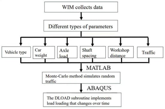First, the relevant parameters of each variable are obtained from the data collected by the dynamic weighing system (Weight in Motion, WIM) so that the simulated random traffic flow is very similar to the actual traffic flow; second, the random traffic flow is generated in MATLAB; finally, the generated information is transmitted into the ABAQUS subroutine DLOAD using the Fortran language. The DLOAD subroutine is mainly used to define complex load conditions and is used to define changes in non-uniform loading with respect to coordinates, time, number of cells, number of integration points, and other related factors.