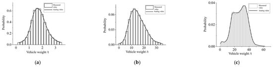 Based on the probabilistic statistical analysis of vehicle parameters (such as model, body quality, workshop distance, etc.) provided by WIM of a bridge in Beiyang Line, Tianjin, the time period of thebselected data is 2022, and the total number of vehicles is 6,178,720. Limited to the acquisition capacity of WIM, the loading speed is 70 km/h of the mean speed in literature [].