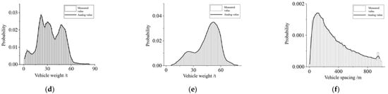 Vehicle load parameters. (a) Mass probability density of two-axle vehicle body; (b) mass probability density of three-axle vehicle body; (c) probability density of four-axle vehicle body mass; (d) probability density of body mass of five-axle vehicle; (e) probability density of six-axle vehicle body mass; and (f) probability density of vehicle spacing.