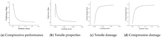 The CDP model in ABAQUS is a continuous, plasticity-based damage model for concrete. The two main failure mechanisms are tensile cracking and compression crushing of concrete material. The model assumes that the uniaxial stretching and compression responses of concrete are characterized by damage plasticity, and in the case of uniaxial stretching, the stress–strain response follows a linear elastic relationship until failure is reached 4. The failure stress corresponds to the occurrence of microscopic cracks in the concrete material. After exceeding the failure stress, the formula of microscopic cracking adopts the softening stress–strain response to make the macroscopic representation so that strain localization is produced in the concrete structure. Although this representation is simplified, it captures the main characteristics of the concrete response. The results of the C50 concrete CDP model parameters measured by Xue [] in 2023 are shown in Figure 4.