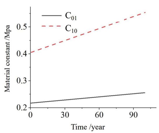 In the formula, n is the actual environmental aging time (years). According to Equations (3) and (4), the variation curves of C10 and C01 are obtained, as shown in Figure 6. As shown in the figure, C10 and C01 increase linearly with an increase in aging time.