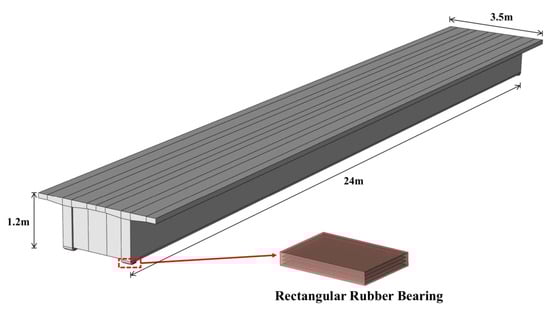 The bridge is a 25 m simply supported beam bridge with a width of 18 m. The T-beam is 1.4 m high, the flange plate is 0.2 m high and 1.8 m wide, and the web plate is 1.2 m high and 0.2 m wide. To improve computational efficiency, the model includes a lane and two beams.