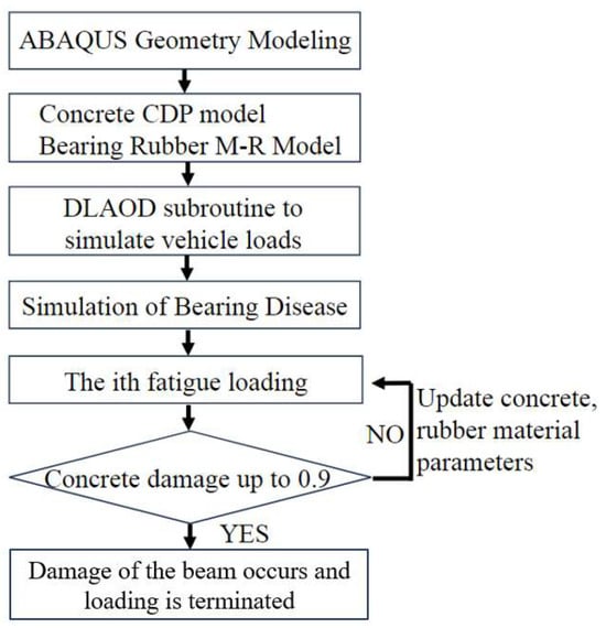 The main calculation process of this article is as follows (Figure 8): according to the simplified principle of fatigue loading times, the fatigue loading times are skipped. When simulating the i-th fatigue loading time (a random traffic flow passing time of 5 min for one fatigue loading), the changes in material parameters of materials such as concrete and rubber in the first N fatigue loading must be considered, and the structural response under the i-th fatigue loading action must be simulated and calculated; after simulating and analyzing the fatigue loading of any cyclic jump, according to the failure criteria of the concrete CDP model, determine whether the structure has fatigue failure. If the structure has a fatigue failure, the cyclic jump and numerical simulation calculation are completed. If the structure is not damaged, according to the principle of simplifying the fatigue loading times, calculate the fatigue constitutive models of concrete and rubber under the fatigue loading times after the next cycle jump step, update the parameters related to concrete fatigue damage and rubber, and return to continue the simulation calculation until the structure is fatigue damaged.