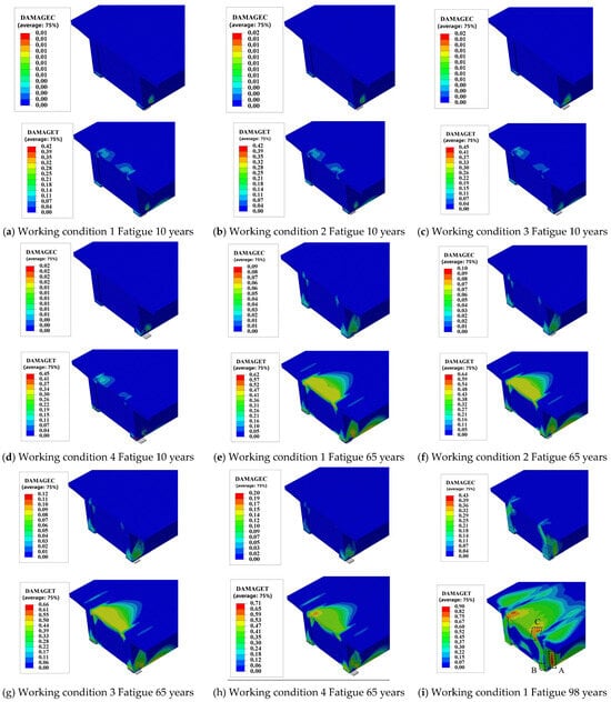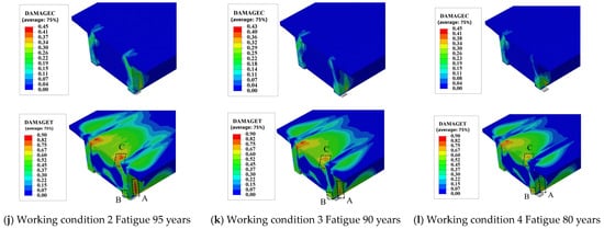The calculation results are shown in Figure 9, where DAMAGEC represents compressive damage, and DAMAGET represents tensile damage in the legend; 0~1 represents the damage rate of concrete. In the figure, 0 represents no damage, and 1 represents complete damage and failure. For quasi-brittle materials such as concrete, it is generally believed that the standard for concrete failure is a damage coefficient of 0.9 []. Fatigue failure occurs after 80 years in working condition four, 90 years in working condition three, 95 years in working condition two, and 98 years in working condition one.