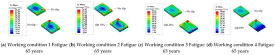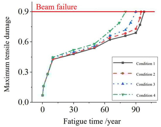 From Figure 10, it can be seen that in the early stage of fatigue calculation (0–10 years), the maximum tensile fatigue damage value of all working conditions increases rapidly, and the difference between different working conditions is not significant; in the mid-term of fatigue calculation (10–65 years), the maximum tensile fatigue damage value of all working conditions increases slowly, and differences begin to appear between different working conditions. Among them, the maximum tensile damage value increases with the increase in the range of motion, and in the later stage of fatigue calculation (65–100 years), the maximum tensile damage value increases rapidly, and the larger the range of deformation, the faster the fatigue failure. This indicates that the damage caused by sliding movement has a significant impact on the service life of T-beams, and measures should be taken in a timely manner.