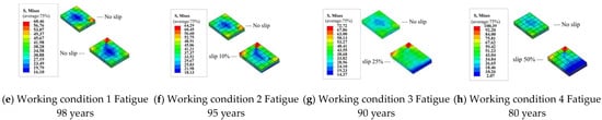 This article summarizes the stress cloud maps of the steel plate inside the bearing under different working conditions, as shown in Figure 11. From Figure 11a,e, it can be seen that when the bearing does not undergo any displacement, the force is mainly borne by the edge area, and the central area is the low-stress area (blue area in the stress diagram). Although stress concentration occurs in the corner of the bearing along the bridge, the stress value is relatively low. From Figure 11b,f, it can be seen that when the bearing undergoes 10% displacement, the low-stress area decreases, and the decrease in the low-stress area increases with the increase in fatigue life. From Figure 11c,g, it can be observed that when the bearing undergoes 25% displacement, the stress concentration area experiences a rapid increase in stress values, while the low-stress area shifts from the center to the outer edge. This is because as the displacement amplitude increases, the outer side of the bearing is no longer under stress. From Figure 11d,h, it can be seen that the stress values in the stress concentration area continue to increase rapidly, while the low-stress area develops from the outer edge to the center, accounting for nearly 50% of the total. This indicates that after the bearing is moved in series, the outer 50% of the area is subjected to less stress.
