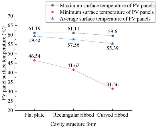 - The average surface temperatures of the flat-plate, moment-ribbed, and arc-ribbed cavity structure PV wall panels under natural ventilation conditions are 59.42 °C, 57.56 °C, and 55.39°C, respectively. The arc-ribbed cavity structure PV wall panels have the best heat dissipation effect. This result aligns with previous studies on ventilated PV systems, which have demonstrated that structured modifications such as ribbing can enhance convective cooling and reduce operational temperatures.