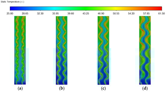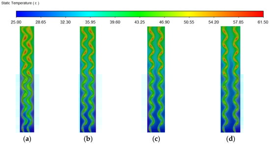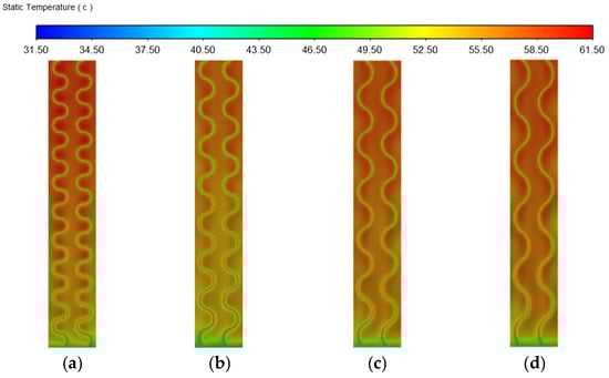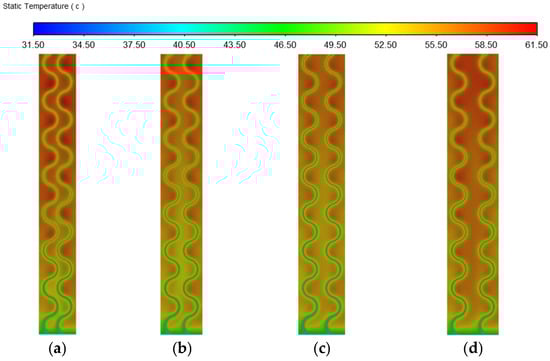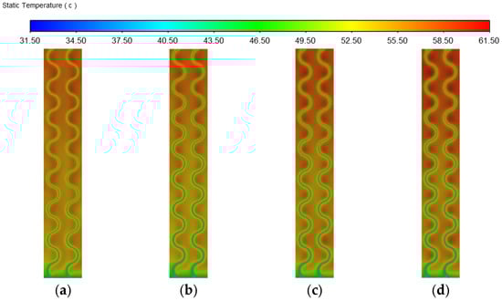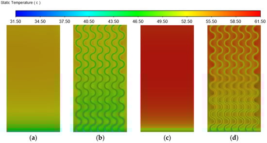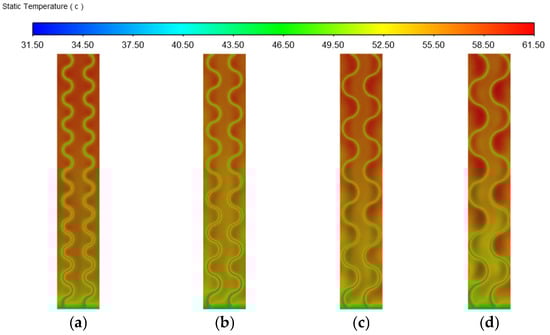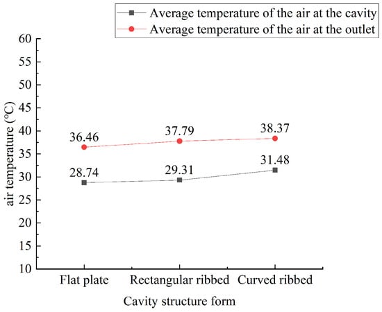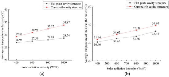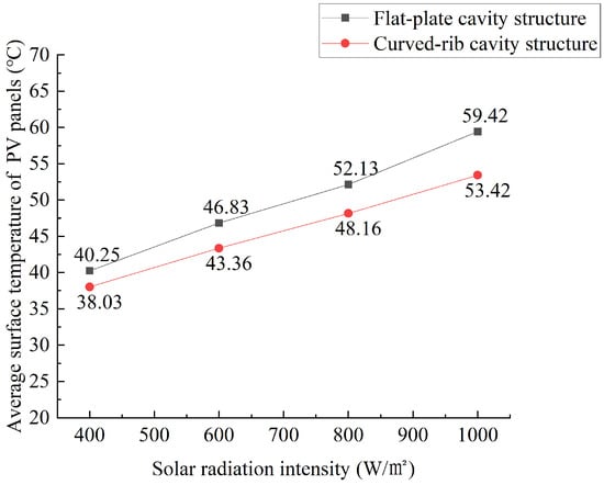 - Compared with the flat cavity structure of PV wall panels, the optimized curved-rib cavity structure can significantly reduce the average surface temperature of PV panels. With the increase in solar radiation intensity, the heat dissipation impact of the optimized structure is enhanced accordingly. When the intensity is 1000 W/m2, the average surface temperature of PV panels can be reduced by 6 °C. These results suggest that structured modifications to PV panel cavities could play a crucial role in improving thermal regulation and operational efficiency in high-temperature environments.