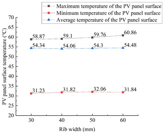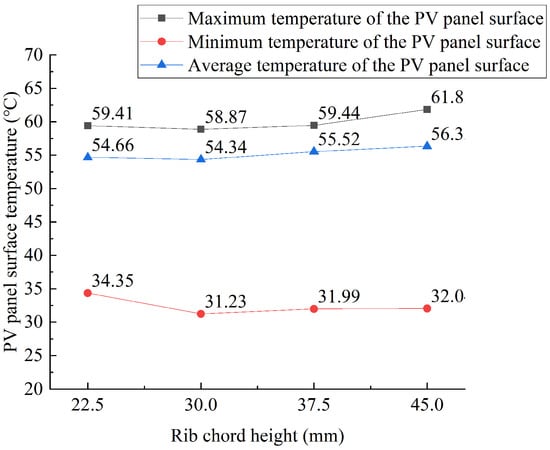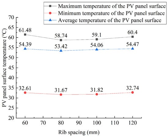 - When the rib curvature is 3/8, the heat dissipation of the photovoltaic wall panel is found to be relatively optimal. If the rib height or width is set too large or too small, it is not conducive to the heat dissipation of the photovoltaic wall panel. Based on the simulations conducted in this study, the performance is relatively better when the rib height is 30 mm and the width is 40 mm. If the rib spacing is too small, the arrangement is too compact, and the hot air cannot be expelled effectively. If the rib spacing is too large, the heat exchange within the cavity is insufficient. The optimal rib spacing is between 80 mm and 100 mm. However, it should be noted that this research only simulated a limited number of configurations and did not cover the full range of possible parameter combinations. Therefore, the results are indicative of favorable configurations in the simulation range.