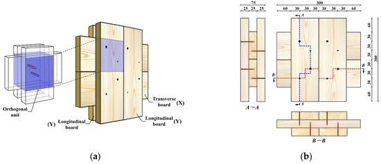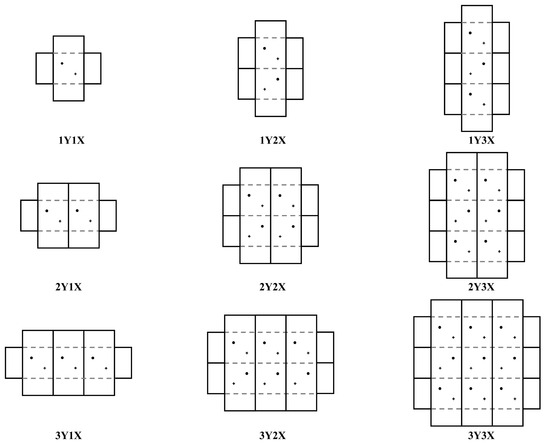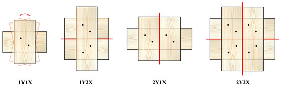 The specimens consisted of three layers of orthogonal timber boards. Wooden nails were driven in with a specialized pneumatic nail gun (F60 CN15-PS90-H, FASCO S.R.L., Cadriano di Granarolo, Italy), set to an output pressure of 0.6 to 0.8 MPa. As shown in Figure 1a, the wooden nails were vertically driven into two adjacent orthogonal layers of the timber boards, ensuring that the tops of the nails were flush with the surface of the outer layer, while the tips penetrated approximately 75% of the thickness of the inner layer. The overlapping area was defined as one orthogonal unit, which consisted of two staggered wooden nails connecting the longitudinal and transverse boards. The symbols were defined as follows: The longitudinal board was denoted as Y, and the transverse board as X. In the front view of the specimen, if the observed number of longitudinal board was n and the number of transverse boards was m, the specimen was denoted as nYmX. For example, the specimen symbol for Figure 1a is 2Y2X, utilizing 8 wooden nails and comprising 4 orthogonal units. Figure 1b presents the specific parameters for the nail arrangement in the 2Y2X specimen, which are also applicable to other specimens. All specimen designs and their symbols are illustrated in Figure 2.