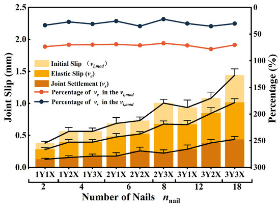 Figure 5 shows the slip within the elastic range for all specimens, along with the percentages of the settlement (vs) and elastic slip (ve) relative to the modified initial slip (vi,mod). As the number of wooden nails in the specimens increased, both the overall slip and settlement also rose, indicating that a greater number of wooden nails led to larger local deformations and enhanced resistance to deformation. The mean percentages of the overall settlement (vs) and elastic slip (ve) relative to the modified initial slip (vi,mod) were 30.62% and 71.28%, respectively, with coefficients of variation of 11.54% and 4.36%. This suggests that the elastic behavior of each specimen remained relatively stable within the elastic range, while the larger variability in settlement indicates uncertainties during the initial adjustments of contact surfaces and material compaction. The high proportion of elastic slip and the lower percentage of settlement further indicate that under load, the joints primarily exhibited elastic behavior, suggesting that most deformations were recoverable, with only a small portion being irreversible [35].