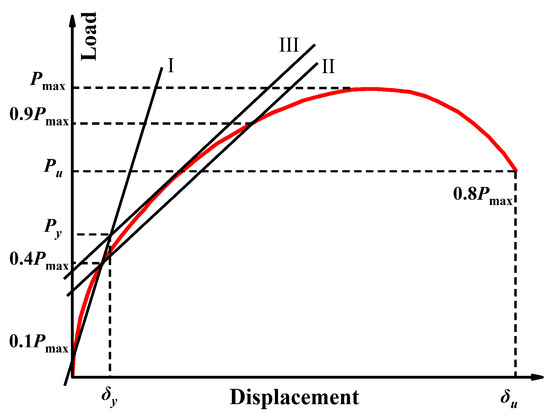 - The y-coordinate of the intersection of Line III and Line I represented the yield load Py, while the corresponding x-coordinate indicated the yield displacement δy;