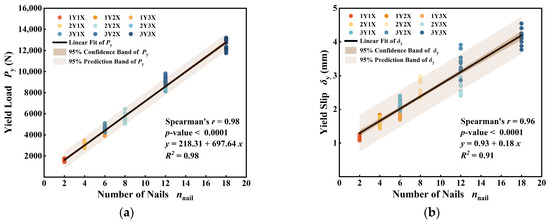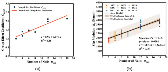 As shown in Figure 11a, a linear regression analysis of the group effect coefficients for the nine specimen groups produced a regression equation (Equation (13)) with a goodness of fit (R2) of 0.86. This result indicates that the regression model provides a high degree of fit to the experimental data and accurately reflects the relationship between the group effect coefficient and the number of wooden nails. To further validate the regression model’s reliability, a Spearman correlation analysis was performed to assess the correlation between the group effect coefficient (Cg,slip) of the joint slip modulus and the number of nails (nnail). The analysis revealed a strong positive correlation, with a Spearman correlation coefficient of 0.88 and a p-value below 0.002, confirming statistical significance.
