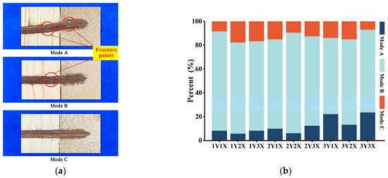 Failure characteristics. (a) Deformation modes of the wooden nails; (b) proportions of the three modes in specimens of the same type.