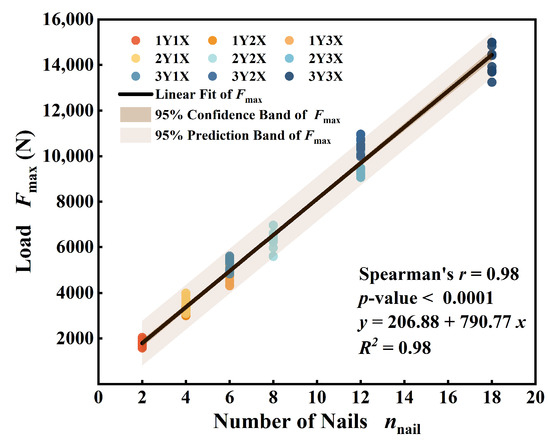 In accordance with EN 26891 [33], the maximum load capacity of the structure was recorded, and the mean values are presented in Table 2. Figure 9 illustrates the results of the analysis of the correlation between the maximum load capacity of the joints and the number of wooden nails. The Spearman correlation analysis yielded a coefficient of 0.98, indicating a very strong positive correlation. Specifically, an increase in the number of wooden nails significantly enhanced the maximum load capacity of the joints. Further linear regression analysis produced the regression equation for these variables (see Equation (7)), with a goodness of fit of 0.98. This indicates that the equation accurately fits the experimental data. These results further confirm the significant impact of the number of wooden nails on the maximum load-bearing capacity of the joints and validate the reliability of the regression model in predicting the joint load capacity.