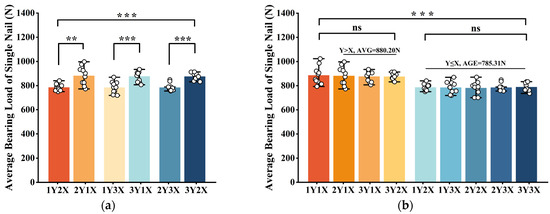 To examine the impact of the wooden nail arrangement on specimens’ load-bearing capacity, a significance analysis was conducted at the 0.05 confidence level using the average single-nail bearing capacity (Table 2), with the results presented in Figure 10. In the figure, “ns” represents p > 0.05, “**” represents p ≤ 0.01, and “***” represents p ≤ 0.001. Figure 10a illustrates a significant difference in the maximum load-bearing capacity among specimens with the same number of wooden nails. Specifically, structures with more nails arranged in rows than in columns exhibited a higher load-bearing capacity. Figure 10b further demonstrates the influence of the nail quantity in rows and columns on the single-nail load-bearing capacity. When the number of nails in rows exceeded that in columns (nrow > ncolumn), the average load-bearing capacity of a single nail was 880.20 N, resulting in a group effect coefficient (Cg,load) of 0.99 and a coefficient of variation (COV) of 0.57%, showing no significant differences. Similarly, when nrow ≤ ncolumn (except for in 1Y1X), the average load-bearing capacity was 785.31 N, resulting in a group effect coefficient (Cg,load) of 0.89 and a coefficient of variation (COV) of 0.33%, also showing no significant differences. These results suggest that when the nail arrangement was consistent (whether nrow > ncolumn or nrow ≤ ncolumn), the load-bearing capacity of a single nail remained stable. The stable group effect was due to the multilayered construction of NCLT, where semi-independent and semi-connected orthogonal units enable a uniform load distribution, maximizing the load-bearing capacity of each nail.