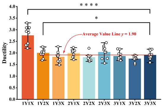 Figure 12 demonstrates a highly significant difference in ductility between the 1Y1X specimen and other grouped connection specimens (p-value < 0.0,001). In the figure, single asterisks (*) represents p ≤ 0.05, and quadruple asterisks (****) represents p ≤ 0.0001. This suggests that the experimental results are unlikely to have resulted from random error and possess substantial statistical significance. Furthermore, with the exception of the 1Y1X specimen, the ductility of other grouped connection specimens showed significant differences (0.01 < p-value < 0.05), although these differences exhibited relatively weaker statistical significance. These findings suggest that the number and arrangement of wooden nails had a negligible impact on the ductility of the structure, which demonstrated stable performance. This stability was reflected in a mean ductility of 1.90 and a coefficient of variation (COV) of 9.88%, falling just below the threshold for low-variability systems as defined by the NDS (COV < 10%) [32]. Integrating the findings from Section 3.3, it is evident that in grouped specimens, the nail arrangement and single wooden nails provide adequate ductility for a uniform load distribution [27]. Consequently, the overall load-bearing capacity of a structure can be derived by summing the design values of the single nails.