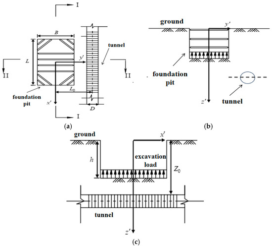 According to the fundamental solution by Mindlin [25], it can be known that under the action of the load () generated by a random point () at the bottom of the foundation pit, the vertical additional stress σz produced at a random point (x′, L0, Z0) on the tunnel axis is