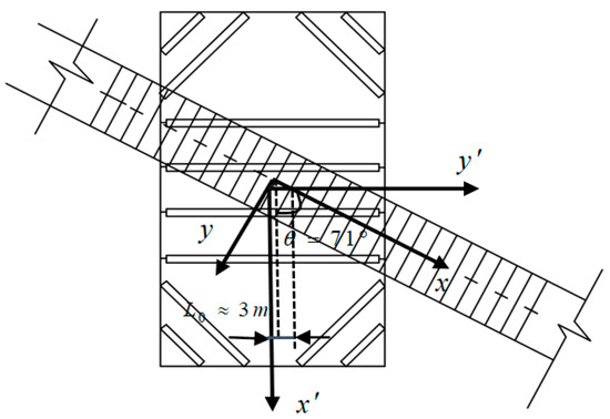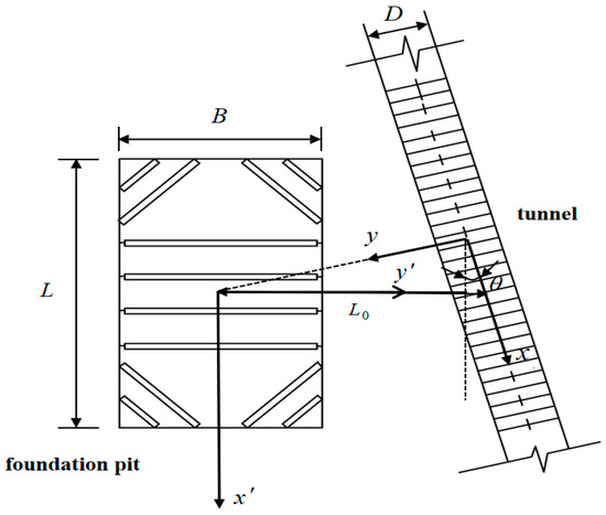 The foundation pit excavation project of the Jiusha River in Hangzhou crosses Metro Line 1. The plane oblique angle is = 71°; there is a distance of under 5 m between the center of the foundation pit and the tunnel axis, which is perceived as the oblique crossing between the foundation pit and the tunnel directly below; the length of the foundation pit is = 47.3 m; the width is = 46 m, the excavation depth is = 6.35 m, and the minimum clear distance from the top of the tunnel to the bottom of the pit is 3 m. The external diameter of the tunnel shield is = 6.2 m. C50 concrete segments are adopted, with a thickness of = 0.36 m and a ring width of = 1.2 m. The shear stiffness between rings is = 7.45 × 105 kN·m−1, = 1.94 × 106 kN·m−1, and = 1.1 × 108 kN·m2 [8]. Figure 5 illustrates a simple planar relationship between the foundation pit and the tunnel.