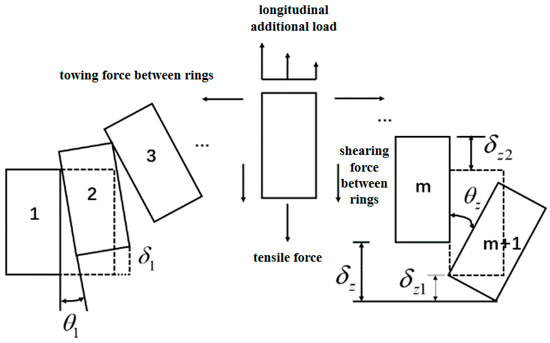 As depicted in Figure 4, denotes the entire vertical displacement between the m-th and (m + 1)-th segments. The vertical displacements originating from the rotation of the segment rings are denoted as , and the vertical displacements produced by the misalignment of the segment rings are denoted as . Thus, Equation is satisfied.