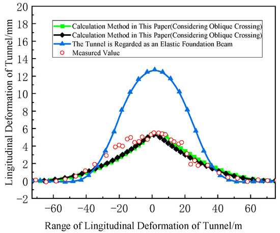 Figure 6 shows the vertical displacement curves of the tunnel calculated in Case 1 for both scenarios, with and without considering the oblique intersection of the tunnel and the foundation pit axis. As shown in Figure 6, when considering the oblique intersection, the maximum deformation of the tunnel, which is 5.535 m, occurs at a lateral coordinate value of 3.365 m. When an oblique intersection is not considered, the maximum deformation of the tunnel (5.492 m) occurs at a lateral coordinate value of 0 m. The maximum measured deformation of 5.507 m occurred at a lateral coordinate value of 3.093 m. The measured vertical displacement of the shield tunnel obtained via the calculation method in this study was essentially consistent with the variation pattern of the measured values, both exhibiting a distinct Gaussian normal distribution. The tunnel’s uplift range was between 60 and 65 m from the center of the foundation pit excavation on both sides. The longitudinal deformation range of the tunnel is associated with the excavation length of the foundation pit, and this connection was analyzed through parameter analysis. However, the traditional calculation method for the elastic foundation beam varies significantly from the measured values, demonstrating that the combined model of rotation and dislocation is more accurate. When the tunnel is situated directly beneath the foundation pit, the maximum vertical displacement varies by only 0.043 m, regardless of whether the oblique intersection between the foundation pit and the tunnel is taken into account, making it almost negligible.