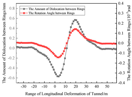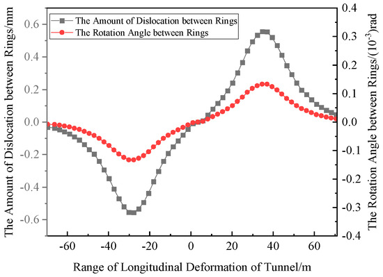 The dislocation and rotation angles of ring segments can impact the safety of the tunnel structure and its waterproofing system. Higher dislocation and rotation angles between the rings lead to a greater chance of water leaking in the tunnel. Zhang Z.G. et al. [33] carried out a grade classification for the safety assessment of the dislocation and rotation angle; thus, the calculation of the dislocation and rotation angle is of great significance. Figure 7 shows the dislocation and rotation angle of the tunnel calculated using the method in this study. The figure indicates that when the tunnel’s vertical displacement peaks, the dislocation and rotation angles between the rings are nearly zero, despite a sharp increase. The maximum dislocation of 0.555 mm and the largest rotation angle of 0.133 × 10−3 rad were observer at the inflection point of the tunnel’s vertical displacement curve, which is located about 37 m from the excavation center near the excavation area’s edge.