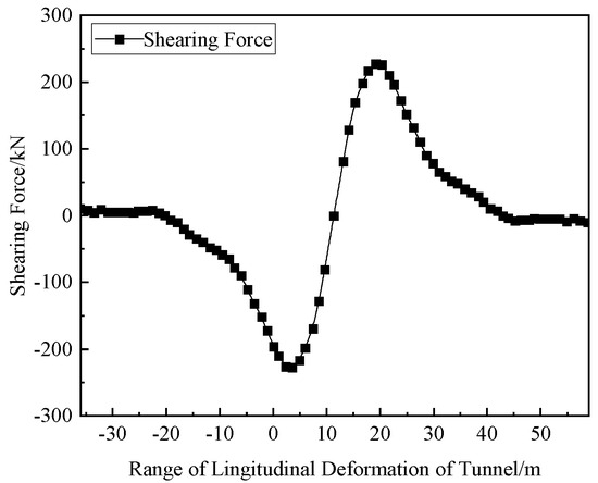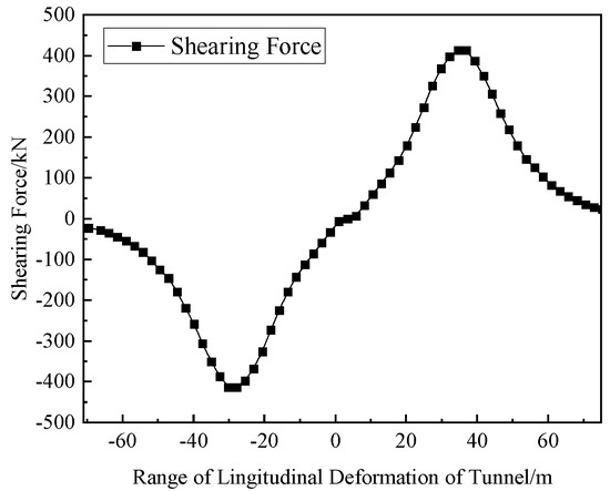 The shear forces between the tunnel rings, as calculated, are depicted in Figure 8. The variation pattern of the tunnel shear force was in accordance with that of the misalignment. The position with the maximum misalignment generated a maximum shearing force of 413.48 kN.