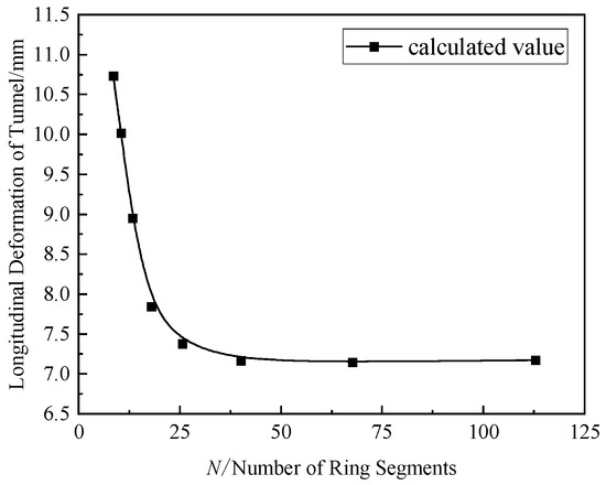 Within the calculation scope of the shield tunnel, denotes the number of ring segments. Theoretically, increasing the value of , which represents the extent of the foundation pit excavation’s impact on the tunnel, reduces calculation errors but decreases calculation efficiency. Taking Cases 1 and 2 in this study as examples, only the value of was altered, and the peak value of longitudinal deformation was determined.