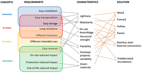Given what was said in the introduction, in order to have an efficient and environmentally friendly temporary building, the structure should be reusable (in different places for different needs), the intervention should be reversible (the impact on the site should be minimized), and low-impact solutions should be chosen for materials and construction technology. These concepts entail the following requirements for a temporary building: