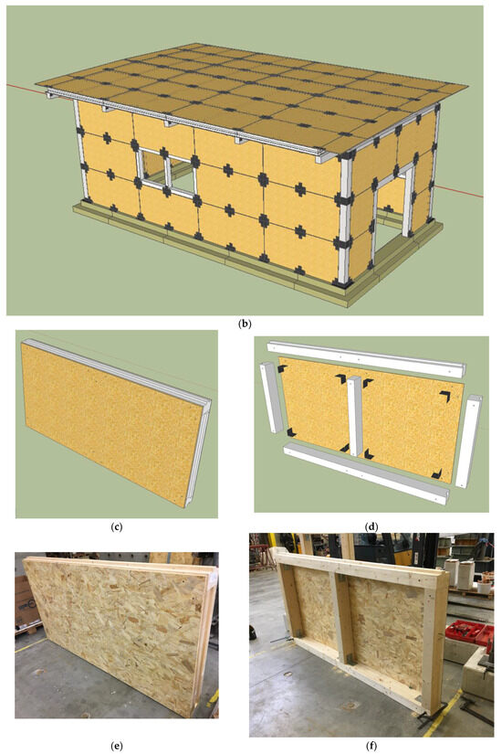 Scheme of the structural components (a) and example of prototype building make-up with the modular system proposed here (b). External (c), inner (d) 3D-schematic views of a module. External view of a prototype module (e) and view of the internal part of a module (f).