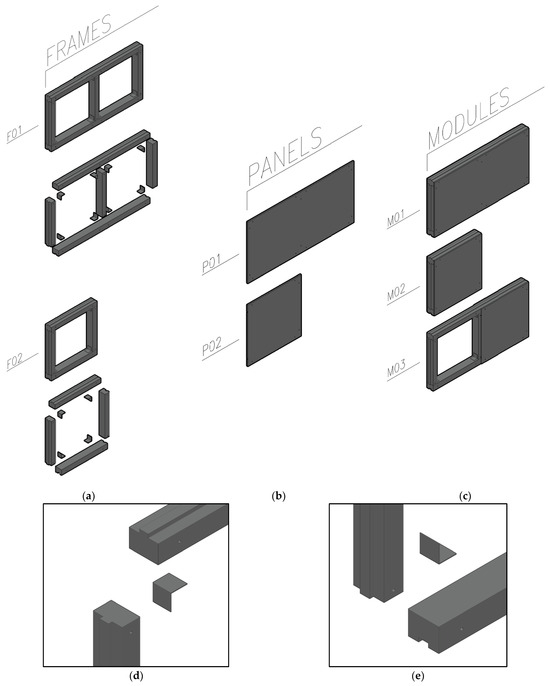 Main elements of the modular system. (a) perimeter frames “F”, (b) closing lateral panels “P”, and (c) assembled modules “M”. (d,e) Details of cross-section and connection of the main elements of the frames F.