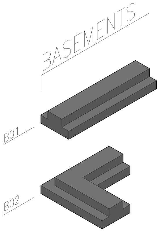 In addition to the above-ground structure, the building system proposed here involves the adoption of precast-reinforced concrete foundation elements, which provide the support to the vertical elements of the wooden structure. The foundation elements have an overturned T cross-section with a typical length that is equal to the main dimension of the modular elements, i.e., 1250 mm or 2500 mm. The main dimensions of the cross-section have been designed with reference to the vertical loads, and the different foundation elements are then connected between them by means of external steel connections. The 3D views of the precast-reinforced concrete basement elements (elements “B”) of the foundation system are showed in Figure 4.